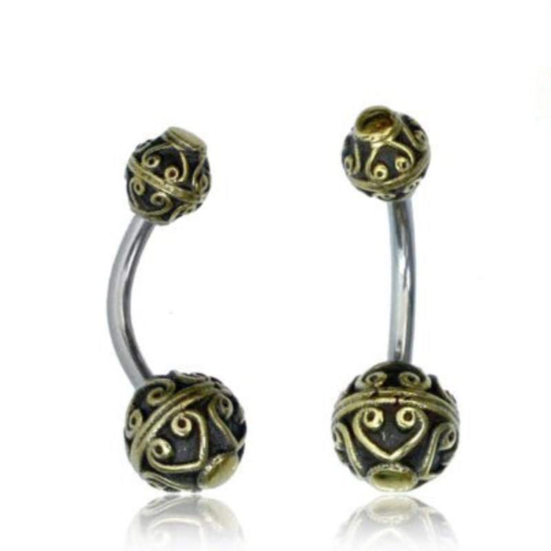 The 14 gauge bali heart belly ring ismade from yellow brass and 316L stainless steel with external threading. The 6mm top ball is removable and the 8mm bottom ball is fixed.