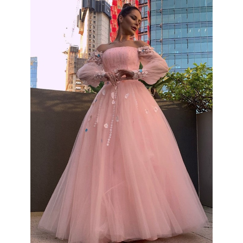 Ball Gown Hand-Made Flower Tulle Long Sleeves Off-the-Shoulder Floor-Length Dresses