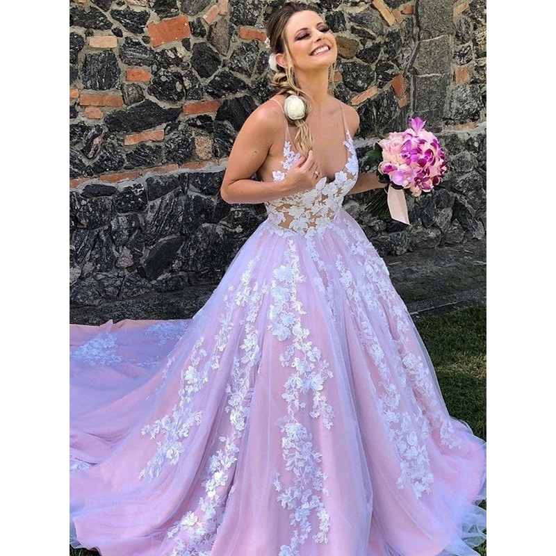 Ball Gown Lace Applique V-neck Sleeveless Sweep/Brush Train Dresses