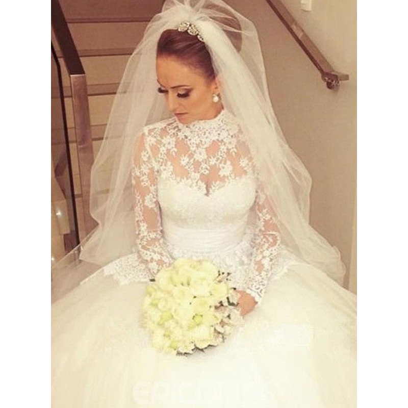 Ball Gown Long Sleeves High Neck Sweep/Brush Train Sash/Ribbon/Belt Lace Wedding Dresses