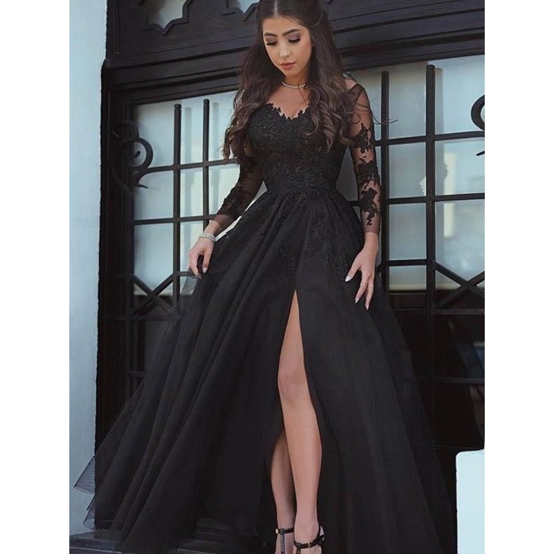 Ball Gown Long Sleeves V-neck Floor-Length Tulle Applique Dresses