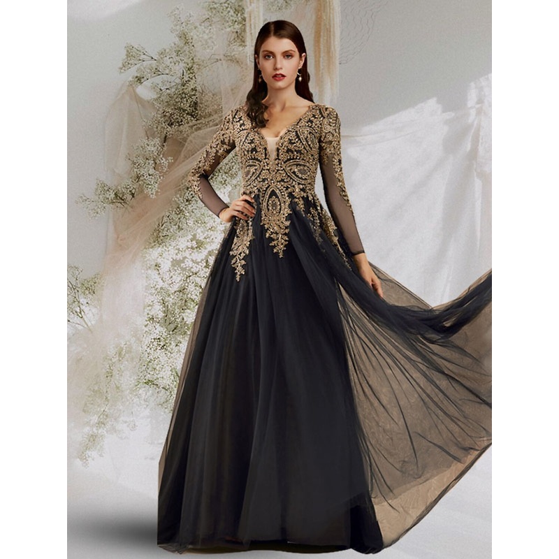 Ball Gown Luxurious Elegant Prom Formal Evening Dress V Neck Long Sleeve Floor Length Tulle with Sequin Appliques