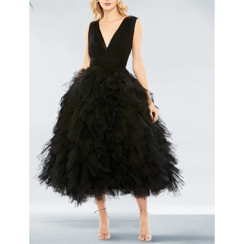 Ball Gown Prom Black Dress Vintage Dress Wedding Party Birthday Tea Length Sleeveless V Neck Tulle with Pleats