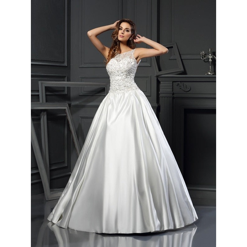 Ball Gown Scoop Applique Sleeveless Long Satin Wedding Dresses