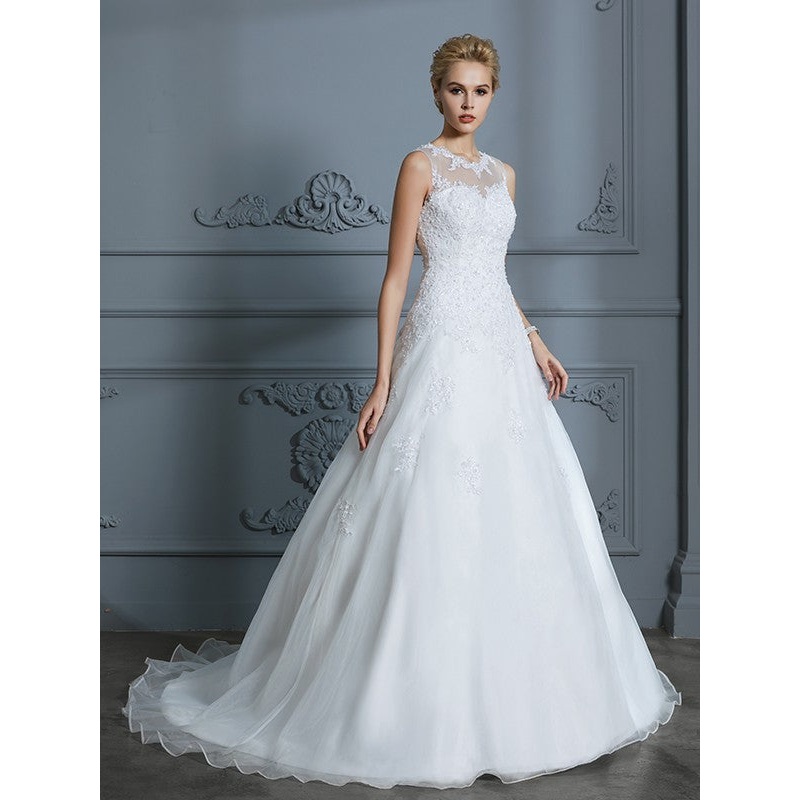 Ball Gown Scoop Sleeveless Organza Court Train Applique Wedding Dresses