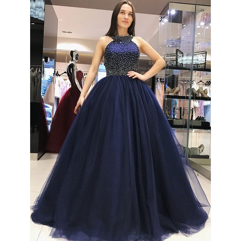 Ball Gown Sleeveless Halter Sweep/Brush Train Beading Tulle Dresses