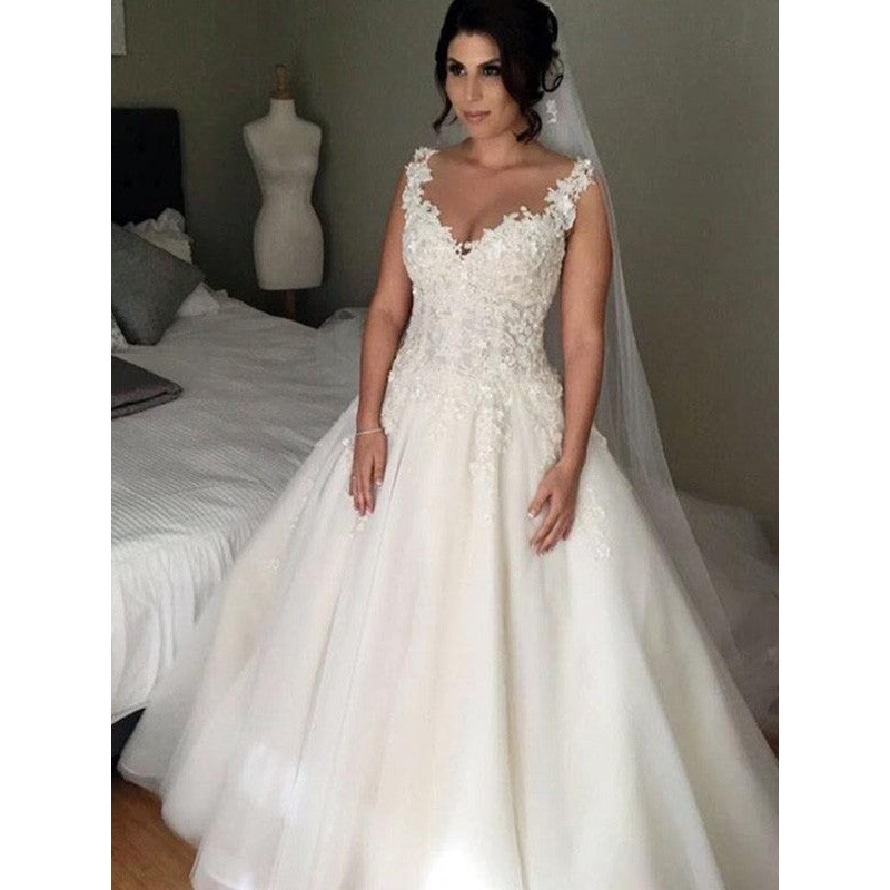 Ball Gown Sleeveless V-neck Court Train Applique Lace Tulle Wedding Dresses