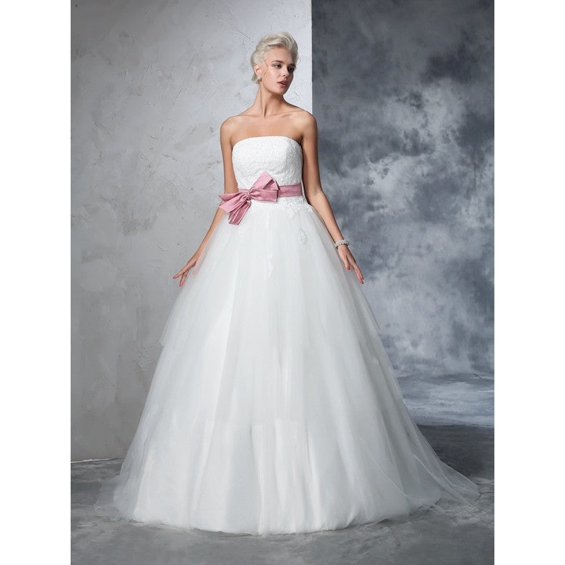 Ball Gown Strapless Bowknot Sleeveless Long Net Wedding Dresses