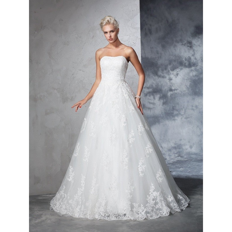 Ball Gown Strapless Lace Sleeveless Long Lace Wedding Dresses
