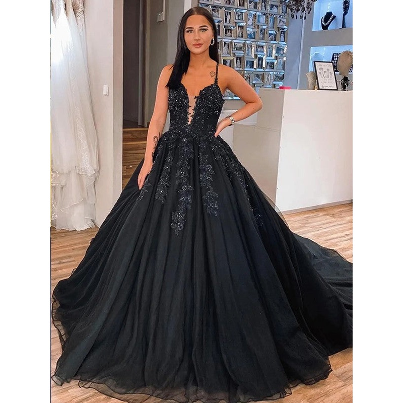 Ball Gown Tulle Applique V-neck Sleeveless Court Train Dresses
