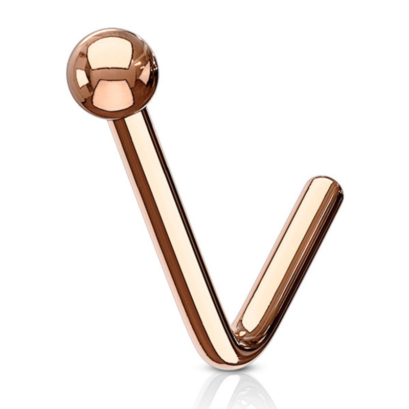 The 20 gauge L-bend nose stud is made from rose gold PVD coated 316L stainless steel. The ball stud has a 2mm diameter.