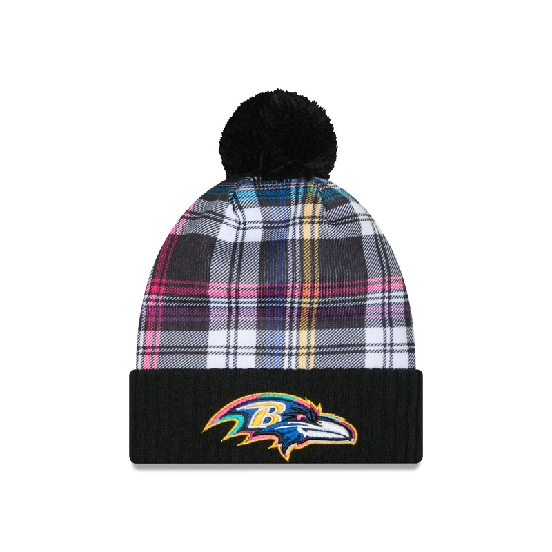 The Baltimore Ravens 2024 Crucial Catch Sport Pom Knit Hat features an embroidered Ravens logo at the front cuff with a Crucial Catch Patch at the right-wear side and an NFL Shield at the rear. Additional details include a plaid crown and a one-time remove