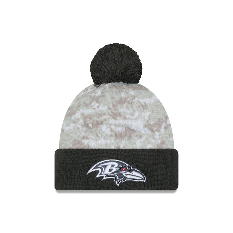The Baltimore Ravens 2024 Salute to Service Pom Knit features an embroidered Ravens logo at the front with the official NFL Salute to Service patch at the rear. Additional details include an snow camo fabrication, an American flag patch at the right-wear s