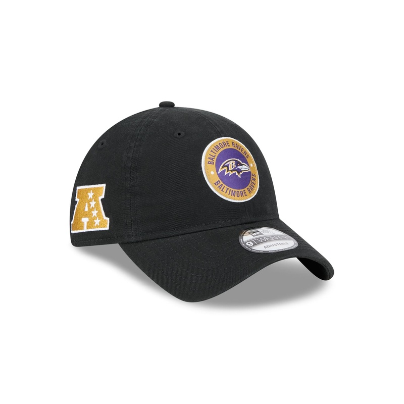 The Baltimore Ravens 2024 Sideline 9TWENTY Adjustable Hat features an embroidered Ravens logo at the front panels with a matching NFL Shield above an adjustable D-Ring closure at the rear and a Conference patch at the right-wear side.