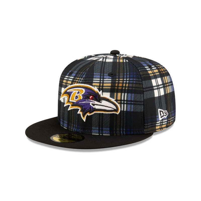 The Baltimore Ravens 2024 Sideline Statement 59FIFTY Fitted Cap features an embroidered Ravens logo at the front panels against a plaid fabrication with a matching NFL Shield at the rear and a gray undervisor.
