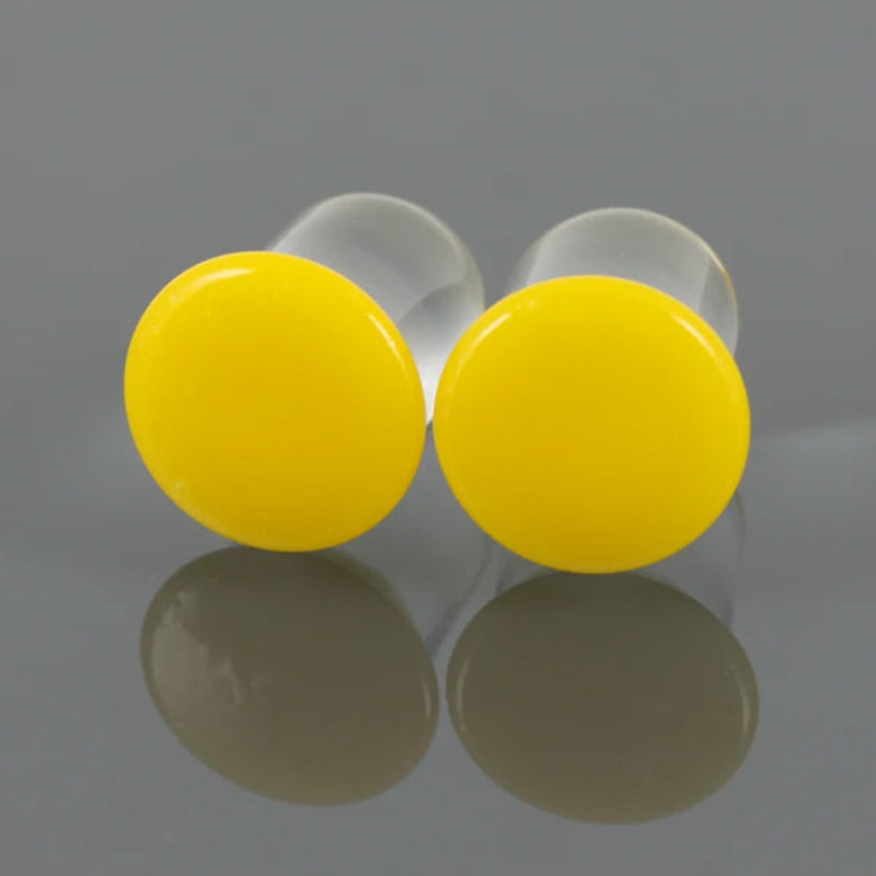These single flare banana color front plugs are made from hand blown borosilicate glass by Glasswear Studios. They have approximately 3/8" wearable area between the flare and o-ring. Two o-rings are included. Choose your size below.