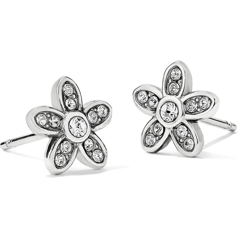 The fire of fine quality crystals sparkles like dewdrops on tiny silver petals in these demure post earrings.