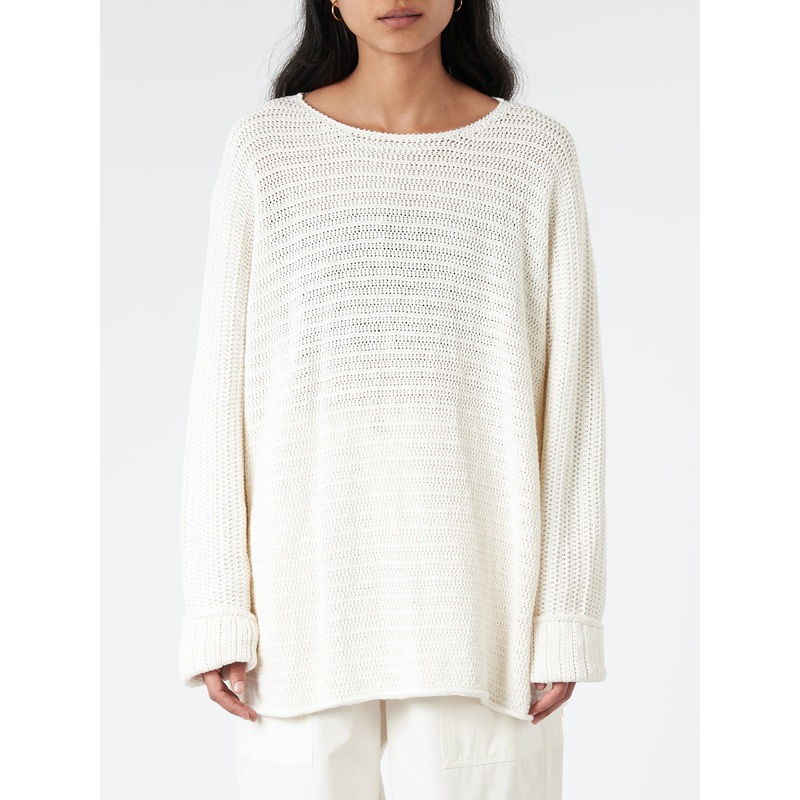 The Basket Pullover is a crewneck sweater with a relaxed fit, expertly crafted with a cotton-linen basket stitch weave.Crew neckInterlaced textured stitchHand crochet finish detail along the neck and armholeSweeping silhouetteMaterialsFabric Content: 70% P