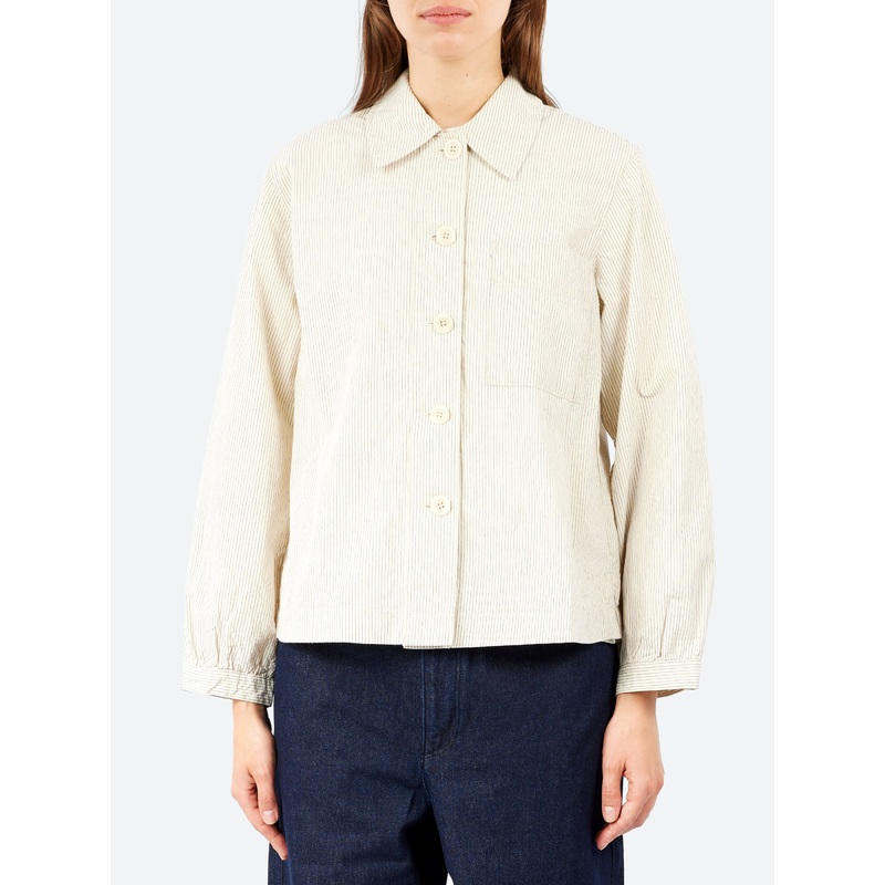TOAST carefree shirt has a large patch pocket which balances the exaggerated collar. Crafted from striped organic cotton poplin with a touch of stretch to a boxy shape, then accented by corozo buttons.