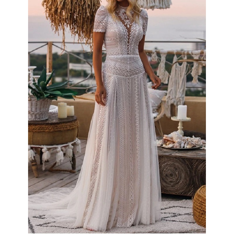 Beach Boho Wedding Dresses A-Line Illusion Neck Short Sleeve Court Train Lace Bridal Gowns With Appliques
