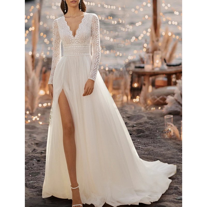 Beach Boho Wedding Dresses A-Line V Neck Long Sleeve Court Train Lace Bridal Gowns With Split Front