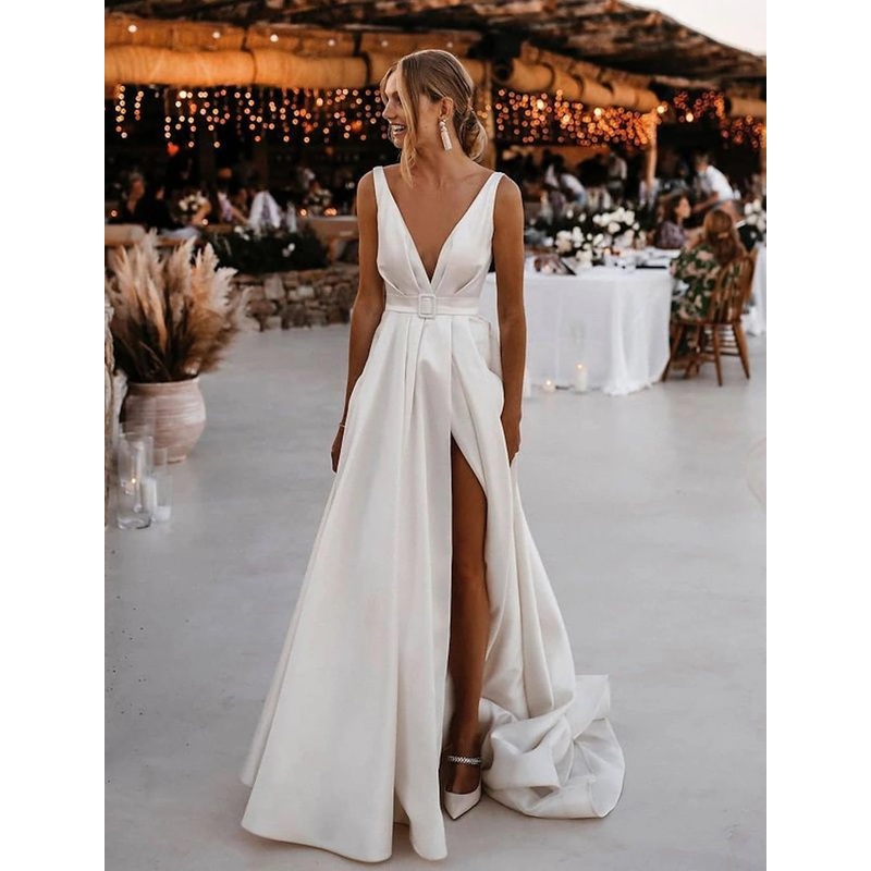 Beach Casual Wedding Dresses A-Line V Neck Sleeveless Court Train Satin Bridal Gowns With Sashes / Ribbons Sash / Ribbon Summer Wedding Party Women’s Clothing