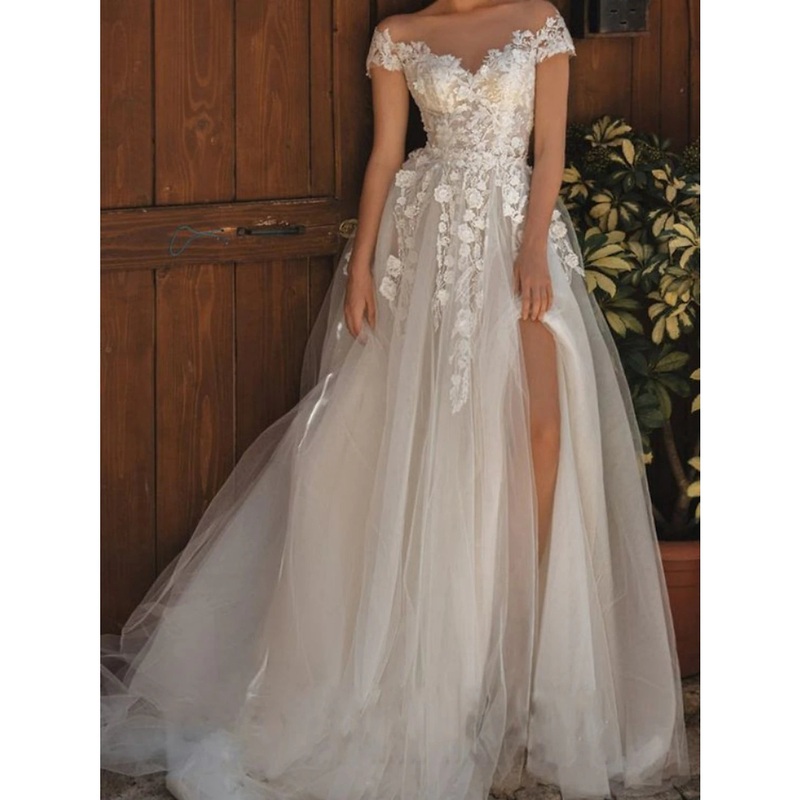 Beach Formal Wedding Dresses A-Line Off Shoulder Short Sleeve Sweep / Brush Train Lace Bridal Gowns With Pleats Appliques