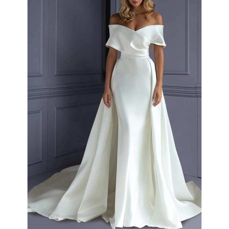 Beach Formal Wedding Dresses Mermaid / Trumpet Sweetheart Off Shoulder Sleeveless Sweep / Brush Train Satin Bridal Gowns With Solid Color