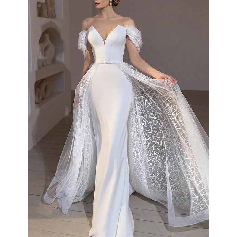 Beach Glitter & Sparkle Wedding Dresses Mermaid / Trumpet Off Shoulder Cap Sleeve Court Train Satin Bridal Gowns With Solid Color