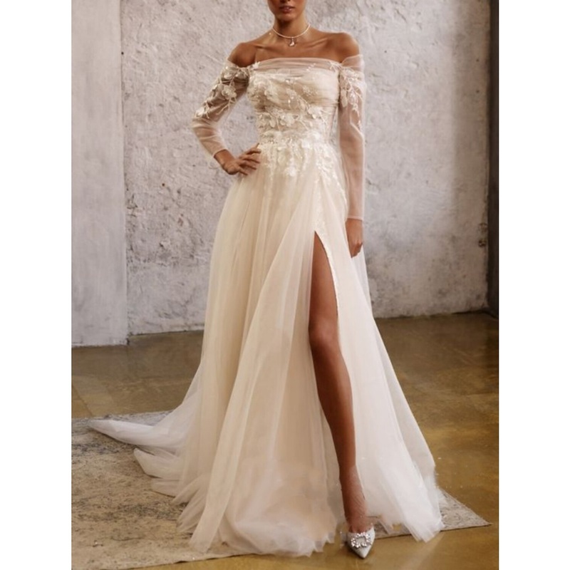 Beach Mature Wedding Dresses A-Line Off Shoulder Long Sleeve Court Train Lace Bridal Gowns With Pleats Split Front