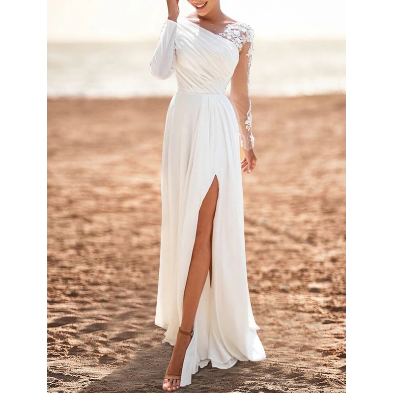 Beach Mature Wedding Dresses A-Line Scoop Neck Long Sleeve Sweep / Brush Train Chiffon Bridal Gowns With Pleats Split Front