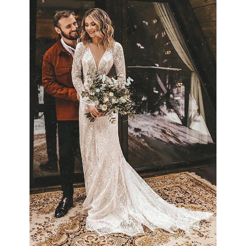 Beach Open Back Boho Wedding Dresses A-Line V Neck Long Sleeve Court Train Lace Bridal Gowns With Solid Color