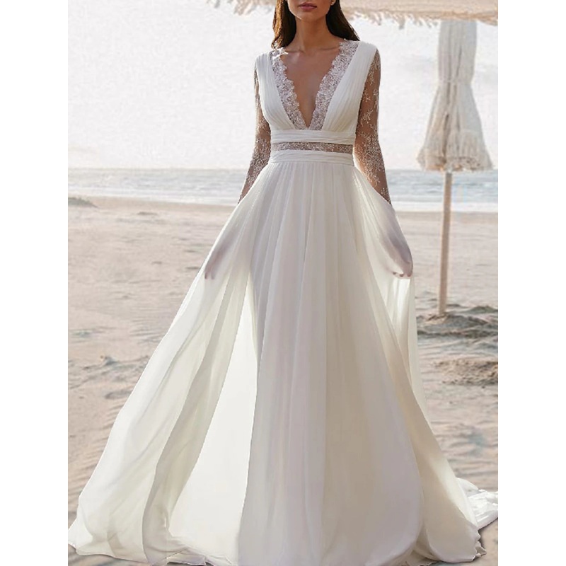 Beach Open Back Boho Wedding Dresses A-Line V Neck Sleeveless Floor Length Chiffon Bridal Gowns With Pleats