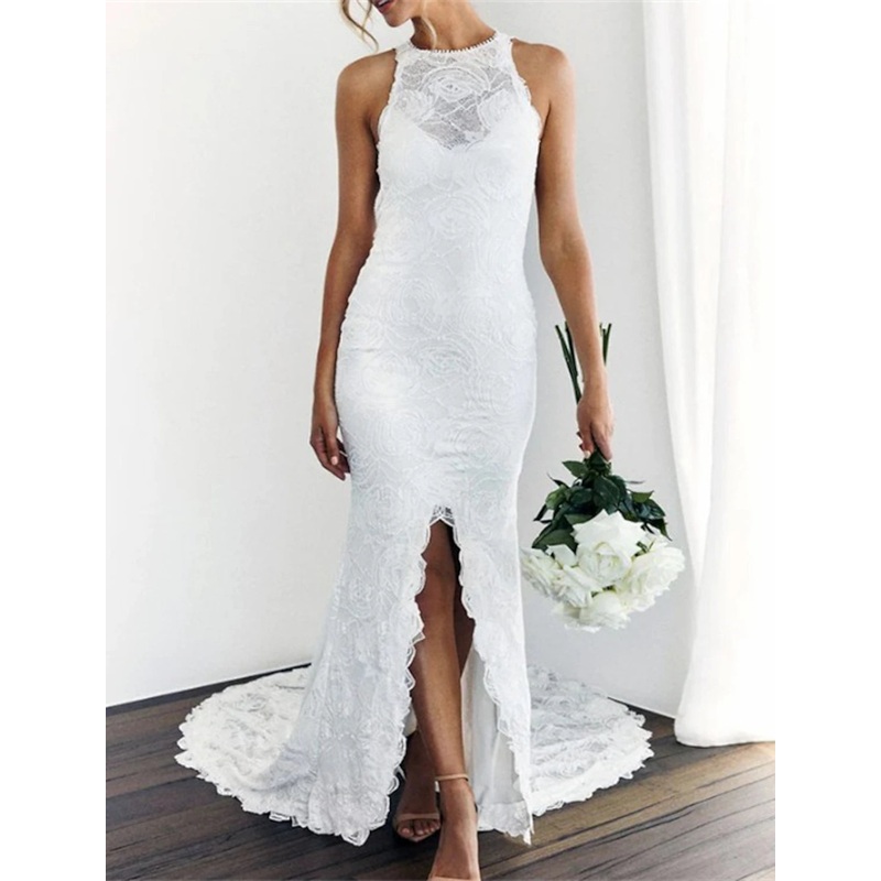Be the first to review “Beach Open Back Boho Wedding Dresses Mermaid / Trumpet Halter Neck Sleeveless Chapel Train Lace Bridal Gowns With Appliques Solid Color”