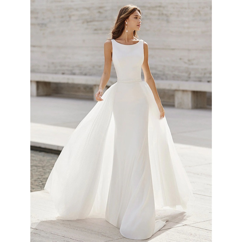 Beach Open Back Wedding Dresses Mermaid / Trumpet Scoop Neck Sleeveless Court Train Satin Bridal Suits Bridal Gowns With Appliques