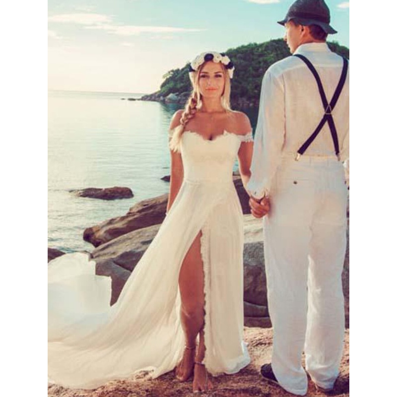 Beach Sexy Boho Wedding Dresses A-Line Off Shoulder Cap Sleeve Court Train Chiffon Bridal Gowns With Split Front Solid Color