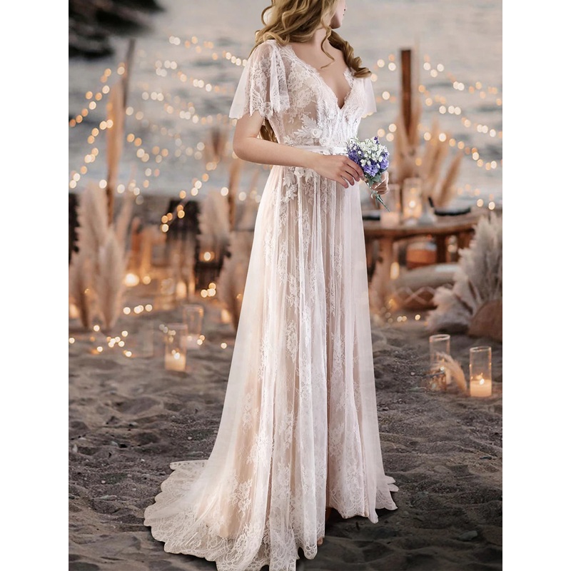 Beach Sexy Wedding Dresses in Color Boho Wedding Dresses A-Line V Neck Short Sleeve Sweep / Brush Train Lace Bridal Gowns With Sashes / Ribbons Sash / Ribbon