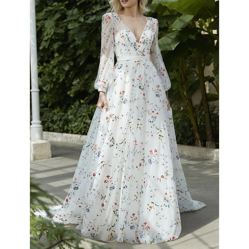 Beach Wedding Dresses in Color Wedding Dresses A-Line V Neck Long Sleeve Court Train Lace Bridal Gowns With Flower