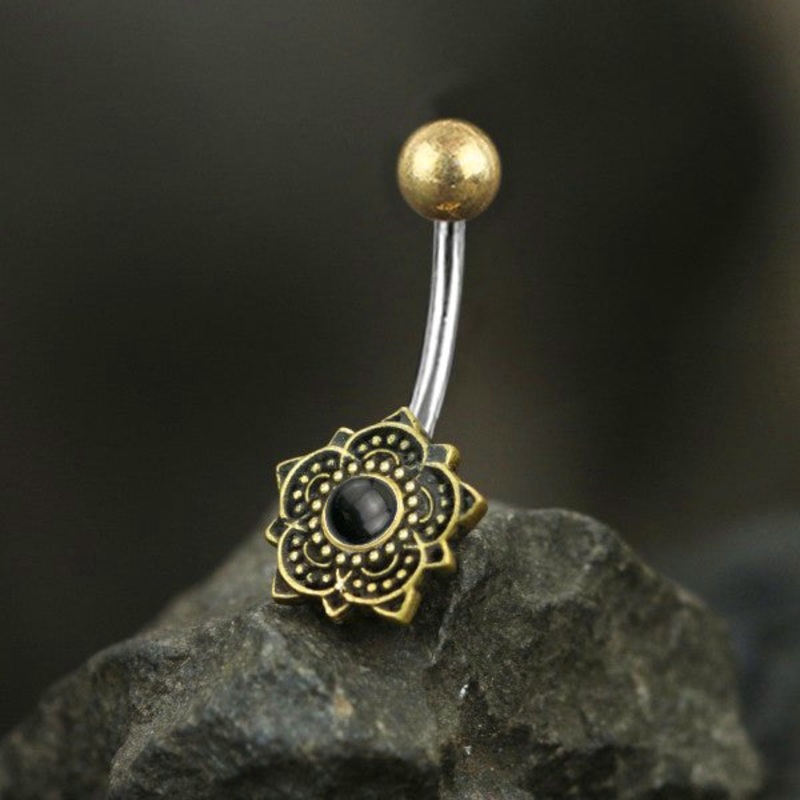 Beaded Flower Yellow Brass Belly Barbell 14g – 3/8″ long (10mm) Black Onyx Yellow Brass
