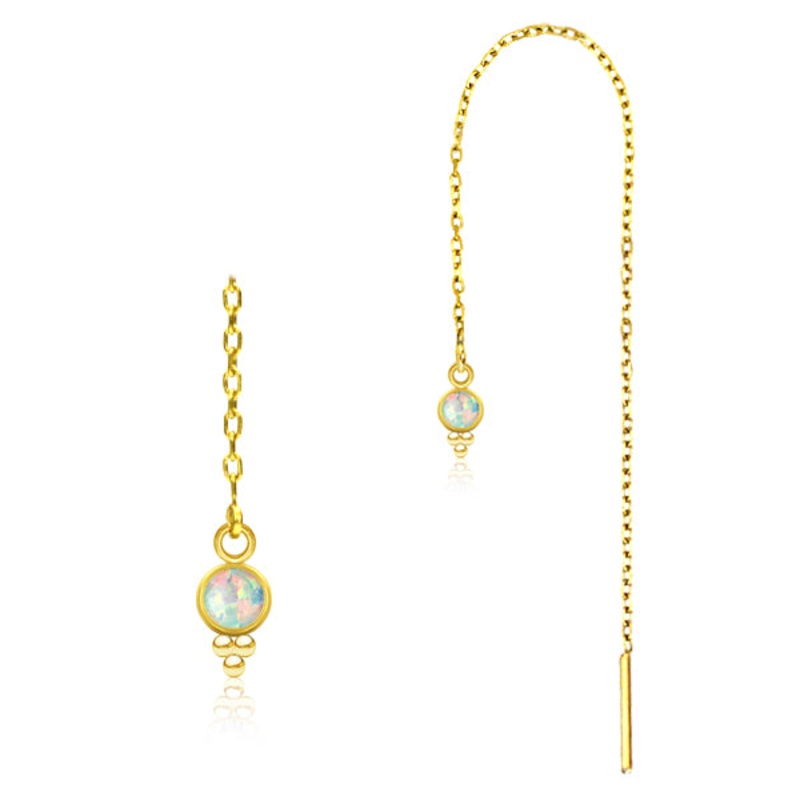 These 20 gauge free fall chainearrings with beaded opal and bar dangles are made from gold PVD coated 316L stainless steel. The chain length is 11cm.