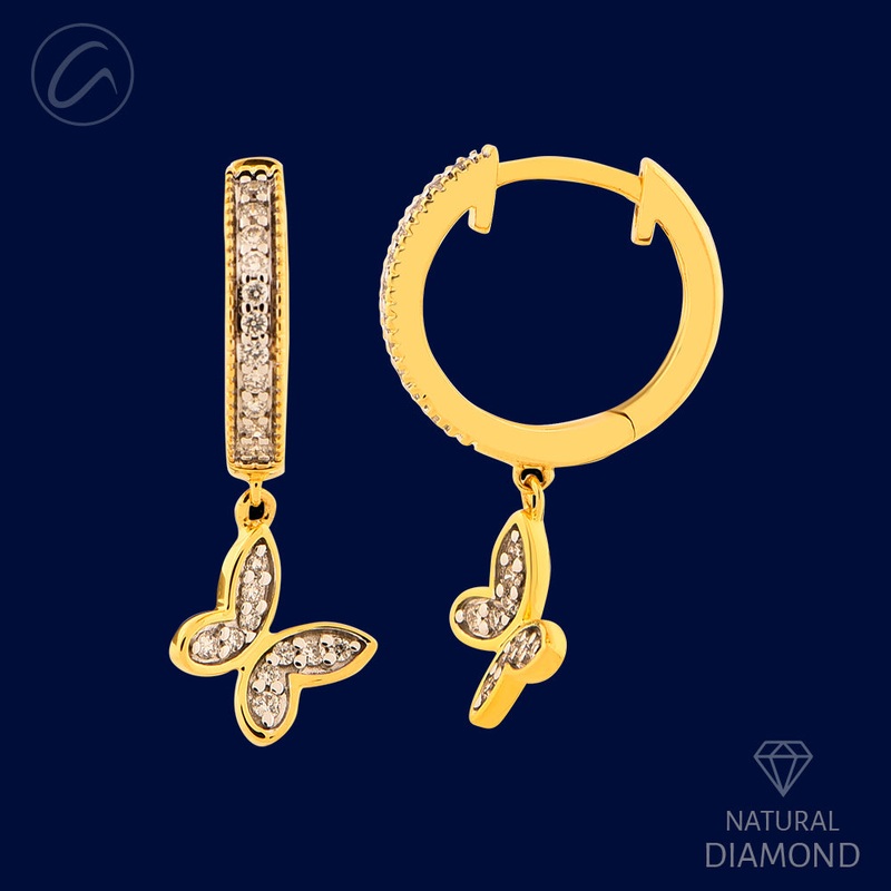 Crafted in elegant 18k yellow gold and weighing 3.2 grams, these hanging Bali earrings feature a graceful butterfly motif accented with 0.19 carats of round brilliant cut diamonds. Graded G-H in color and VS in clarity, the diamonds add a soft sparkle to the 0.8-inch design. The polished finish enhances the golden luster, while the GGL certification ensures trusted quality. Delicate yet eye-catching, this pair blends whimsical charm with refined elegance, making it a lovely addition to any fine jewelry collection.