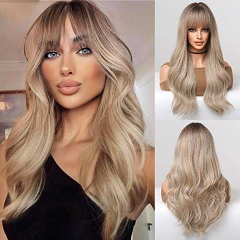 Beige Blonde Long Wavy Wig with bangsCombining beige blonde locks with signature waves, this heat-resistant wig is crafted from the finest of 100% synthetic fibers, granting the wearer the opportunity to experiment with multiple styling options. With the t