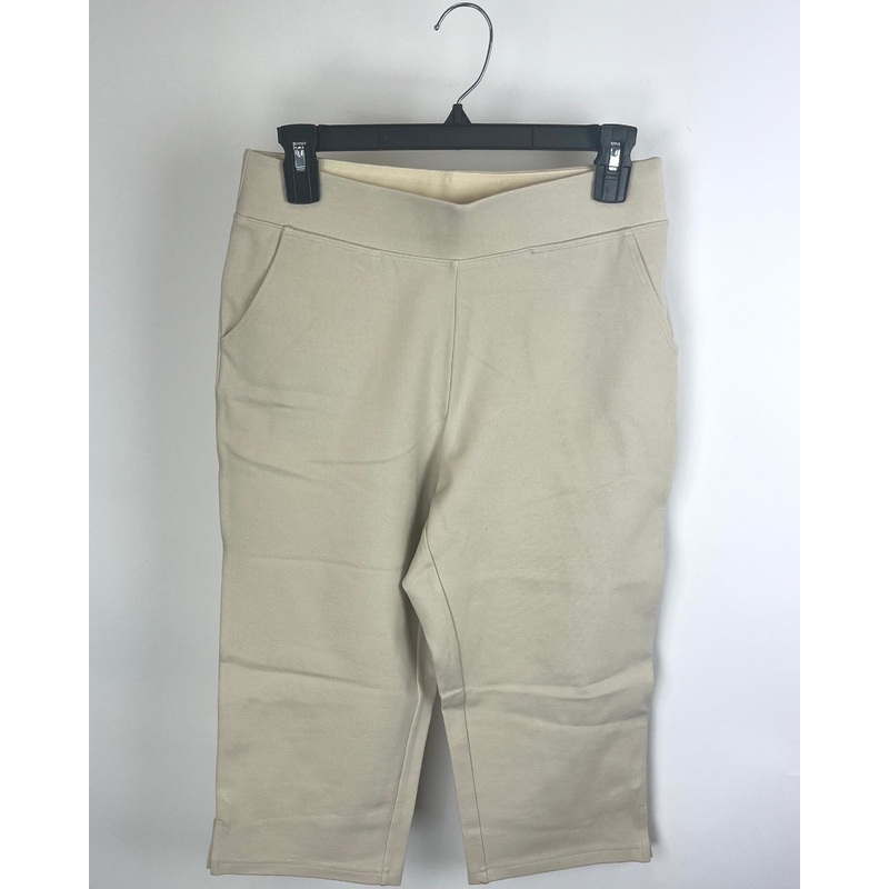 Belle by Kim Gravel beige high rise capri pants with elastic waistband, two front pockets, and approximately two inch slit on outer side of bottom hem.