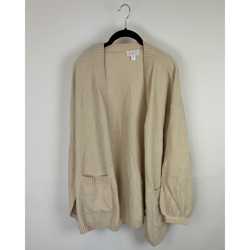 Belle by Kim Gravel beige knit cardigan, balloon sleeve with stretchy cuff, front pockets, soft and stretchy material
