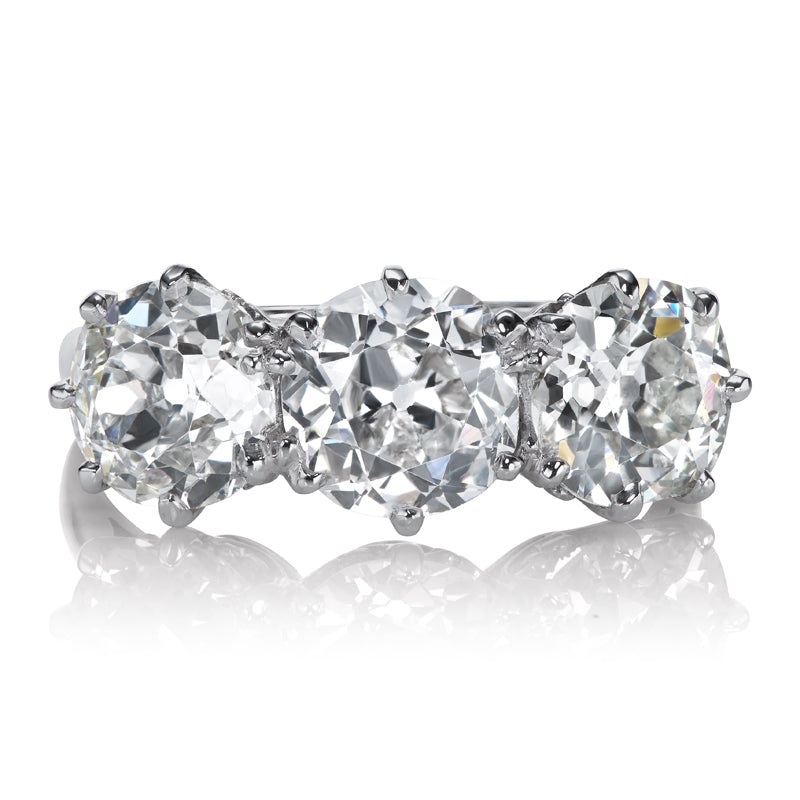 The Bennie ring is an authentic vintage diamond ring from the Edwardian Era circa 1905. The ring centers a GIA-certified 1.25 carat Old European Cut diamond of G color, I1 clarity. The side stone is a GIA-certified 1.17 carat Old European Cut diamond of J color, SI1 clarity. The side stone to the other side of the center diamond is a GIA-certified 1.07 carat Old Mine cut diamond of K color, SI2 clarity. The three stones are prong set in a platinum setting with filigree details in the gallery. The ring is currently size 5.5 and can be resized!