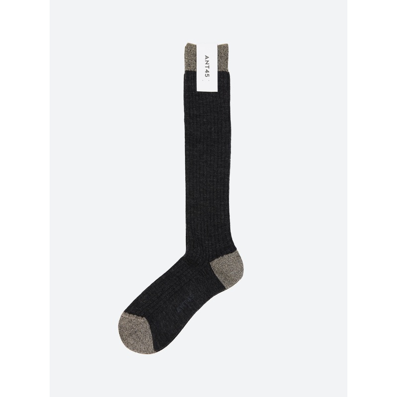 Long socks in wool, solid color ribbed, contrast heel tip and cuff in lurex.