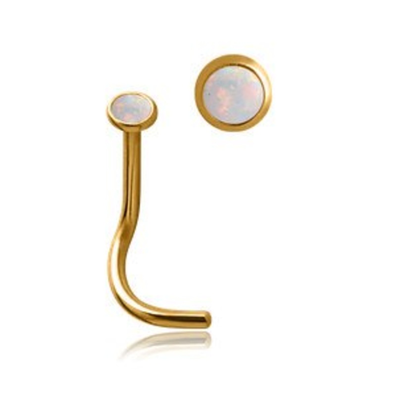 The 18 gauge bezel-set 2.35mm synthetic opal nostril screw ismade from gold PVD coated316L stainless steel. Choose your size below.