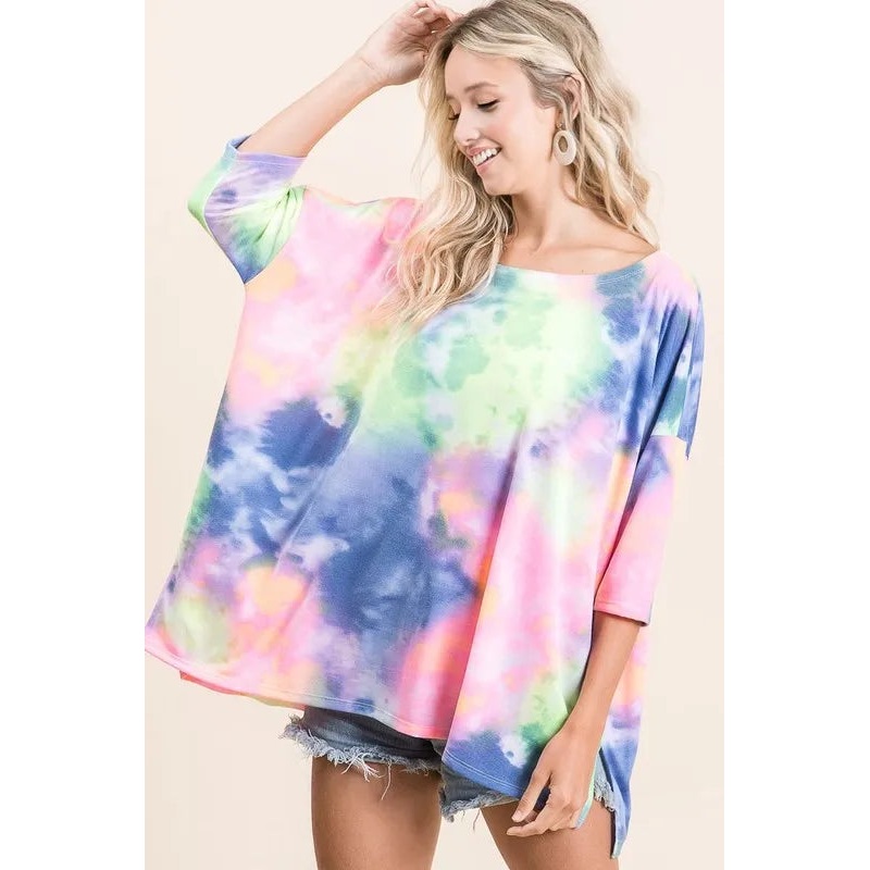 The tie-dye print low gauge knit top is a trendy and eye-catching addition to your wardrobe. The tie-dye print offers a fun and colorful look. The low gauge knit fabric provides a lightweight and comfortable feel. This top is perfect for adding a pop of pe