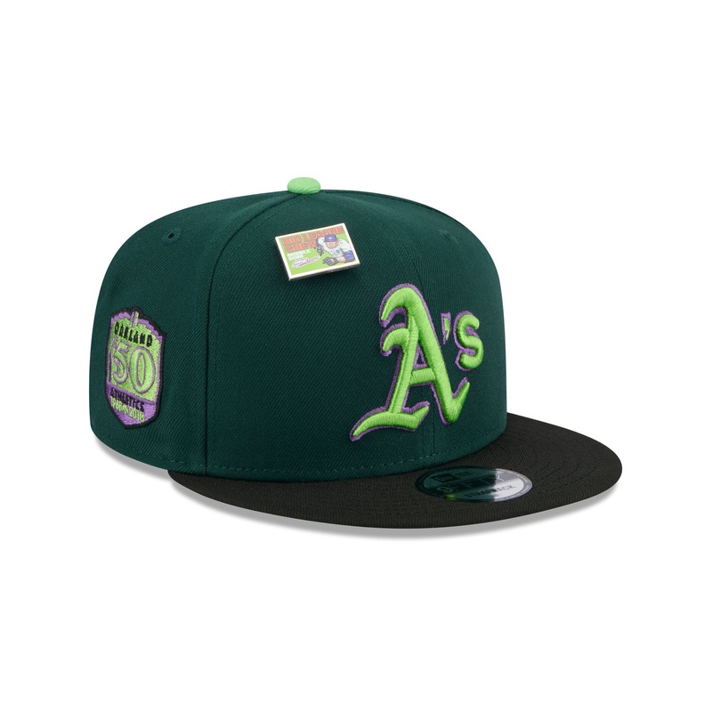 The Big League Chew X Athletics Sour Apple 9FIFTY Snapback features an embroidered Athletics logo and a Big League Chew Sour Apple pin at the front panels with a black visor and a gray undervisor. Additional details include a 50th Anniversary patch at the