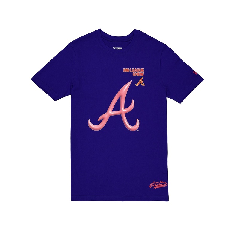 The Big League Chew X Atlanta Braves T-Shirt features a screen-printed Big League Chew wordmark and Braves logo at the left chest with a bubble gum inspired team logo at the chest and an Outta Here Original slogan at the hem.